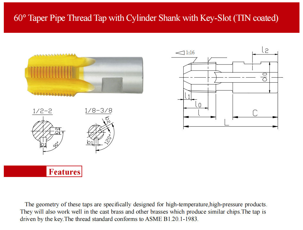 PRODUCT current location:Home > PRODUCT > 60° Taper Pipe Thread Tap with Cylinder Shank with Key-Slot (TIN coated)