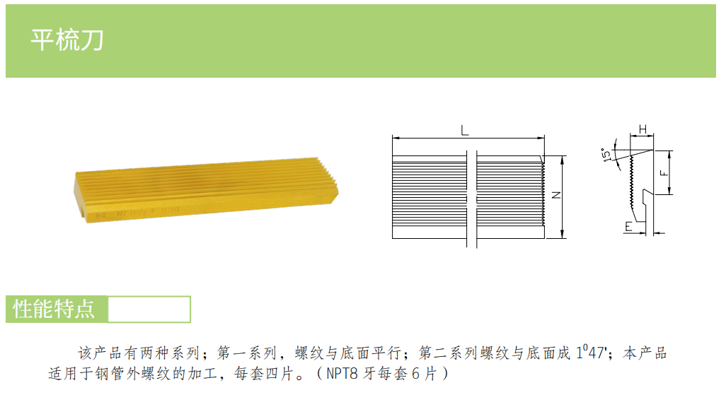 該產(chǎn)品有兩種系列:第一系列,螺紋與底面平行:第二系列螺紋與底面成1°47’;本產(chǎn)品適用于鋼管外螺紋的加工,每套四片。(NPT8牙每套6片)