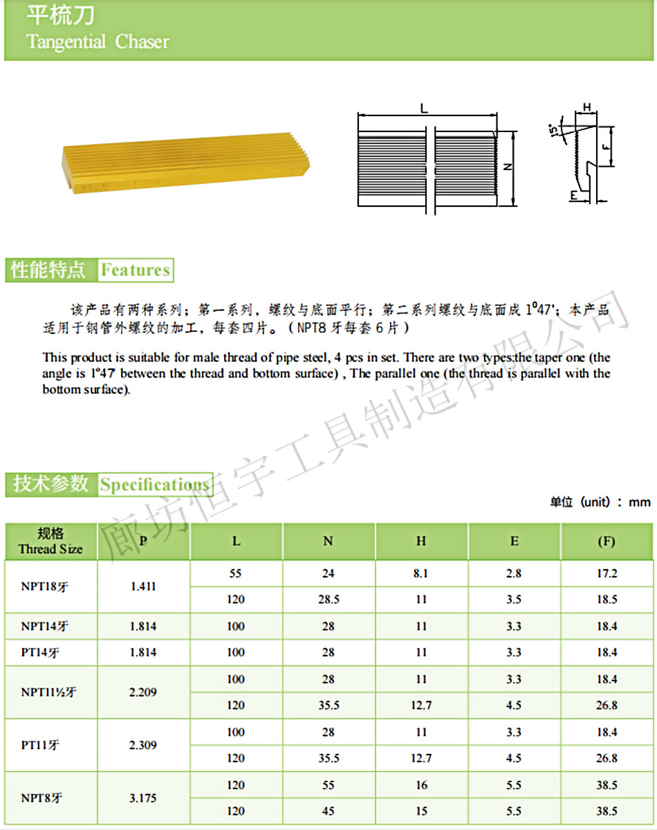 該產(chǎn)品有兩種系列:第一系列,螺紋與底面平行:第二系列螺紋與底面成1°47’;本產(chǎn)品適用于鋼管外螺紋的加工,每套四片。(NPT8牙每套6片)