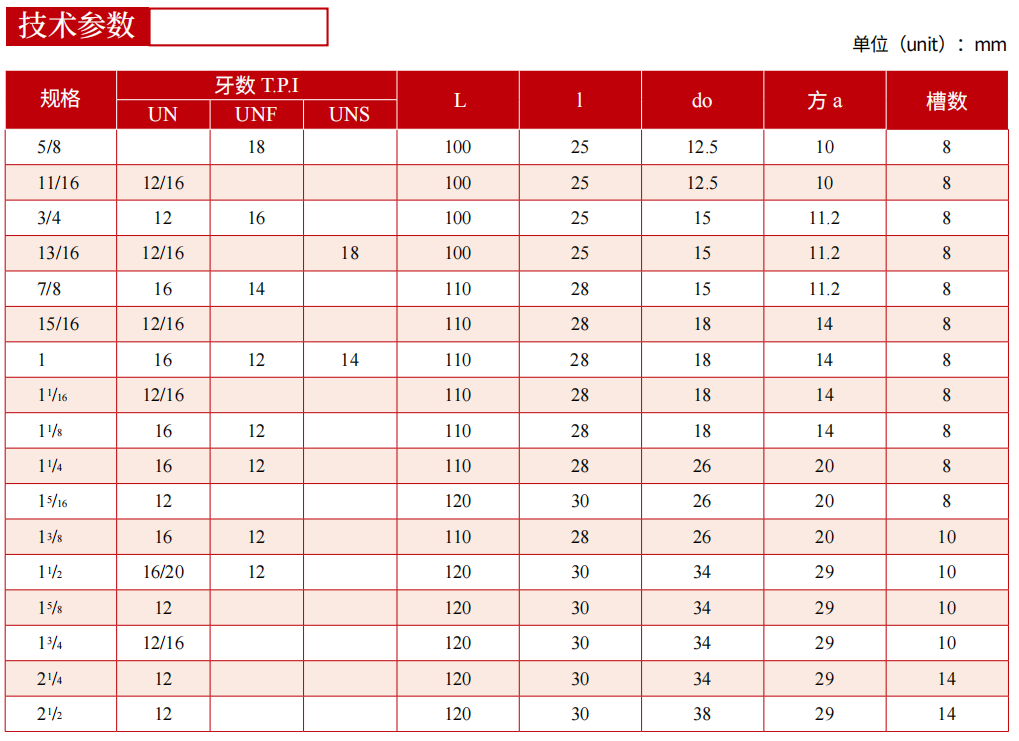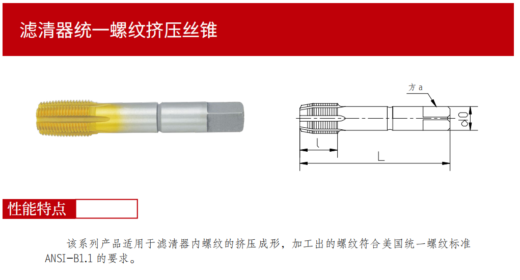 該系列產品適用于濾清器內螺紋的擠壓成形,加工出的螺紋符合美國統一螺紋標準ANSI-B1.1的要求。