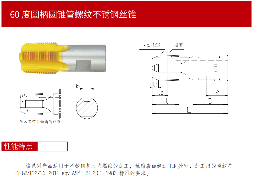 該系列產(chǎn)品適用于不銹鋼管材內(nèi)螺紋的加工,絲錐表面經(jīng)過TlN處理,加工出的螺紋符合GB/T12716-2002 eqV ASME B1.20.1-1983 標(biāo)準(zhǔn)的要求。