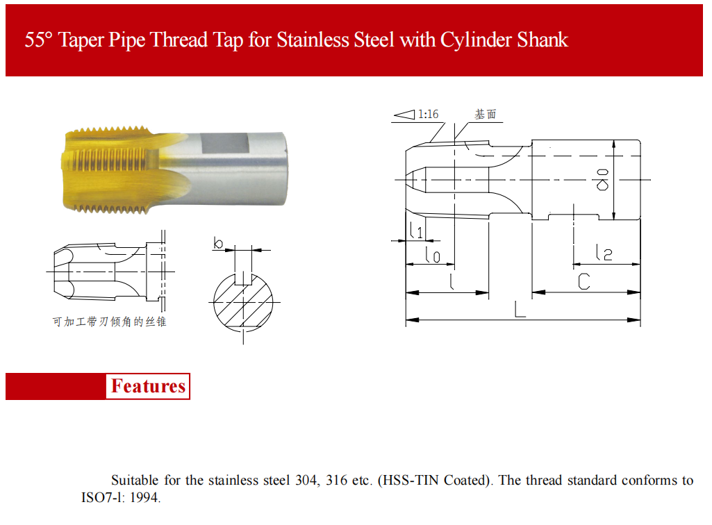 該系列產(chǎn)品適用于不銹鋼管材內(nèi)螺紋的加工,絲錐表面經(jīng)過TiN處理,加工出的螺紋符合 GB/T7306.2 eqv IS07-1:1994 標(biāo)準(zhǔn)的要求。