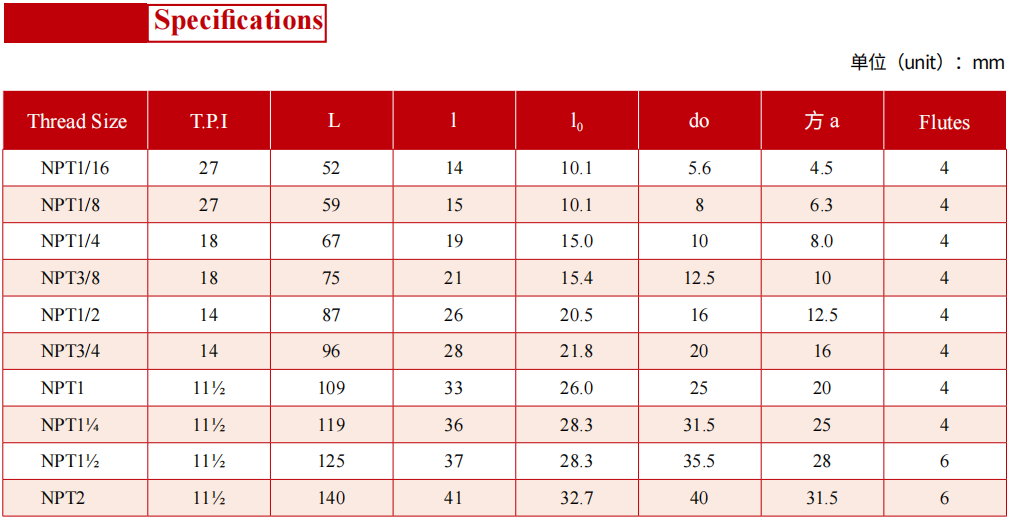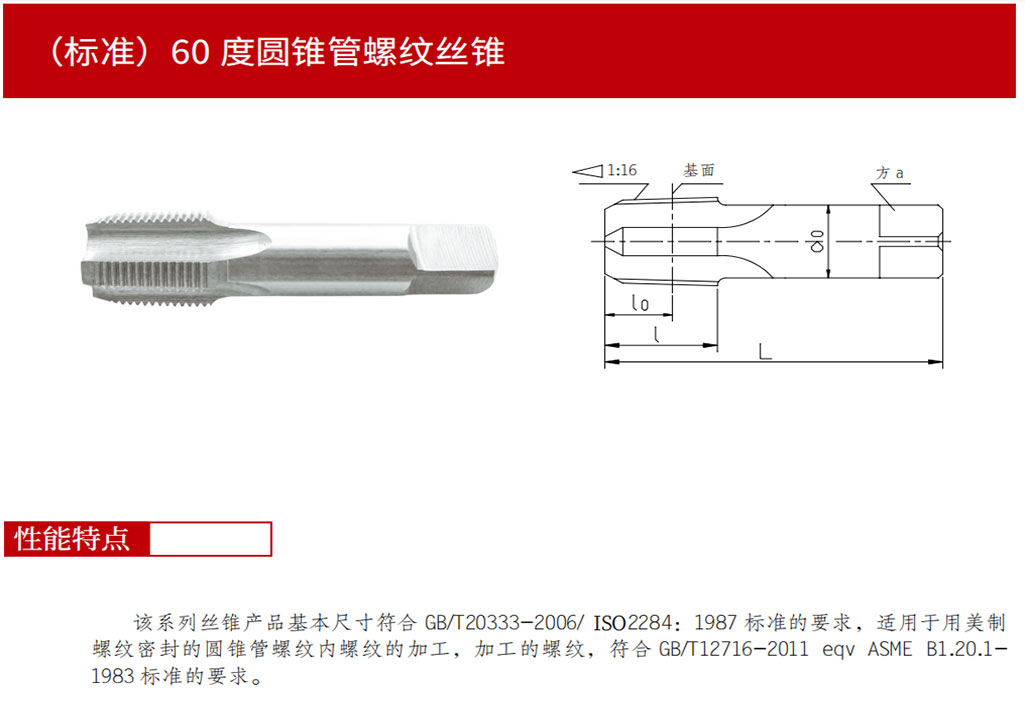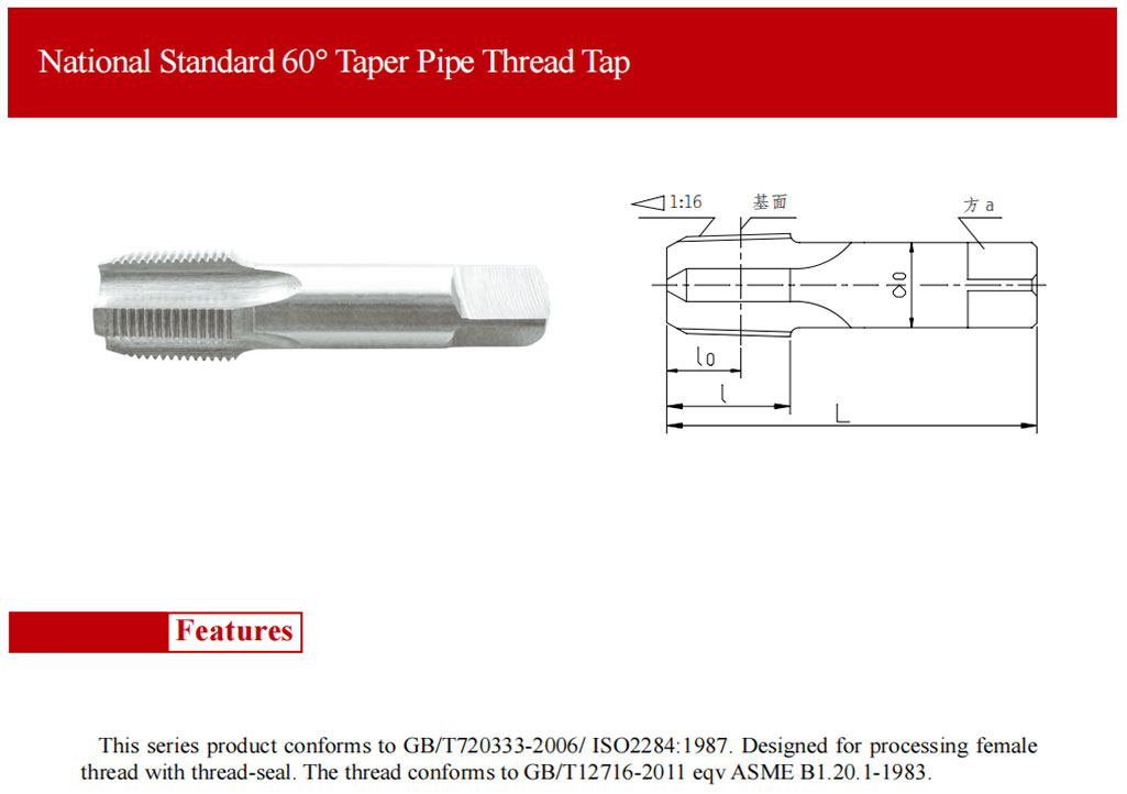 該系列絲錐產(chǎn)品基本尺寸符合 GB/T20333-2006/IS02284:1987 標(biāo)準(zhǔn)的要求,適用于用美制螺紋密封的圓錐管螺紋內(nèi)螺紋的加工,加工的螺紋符合 GB/T12716-2011 eqv ASME B1.20.1-1983標(biāo)準(zhǔn)的要求。
