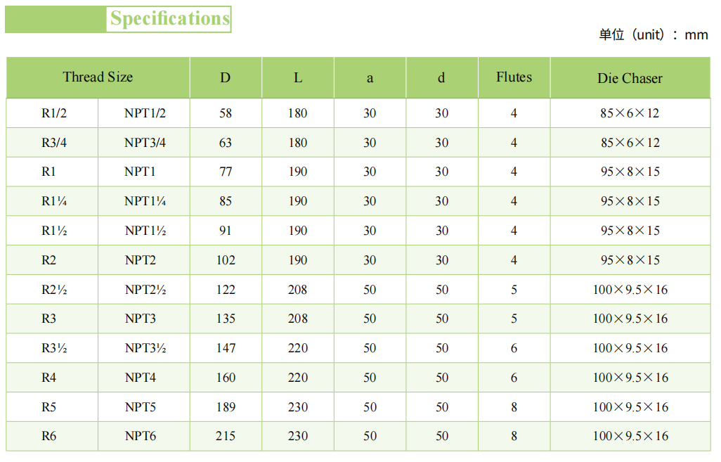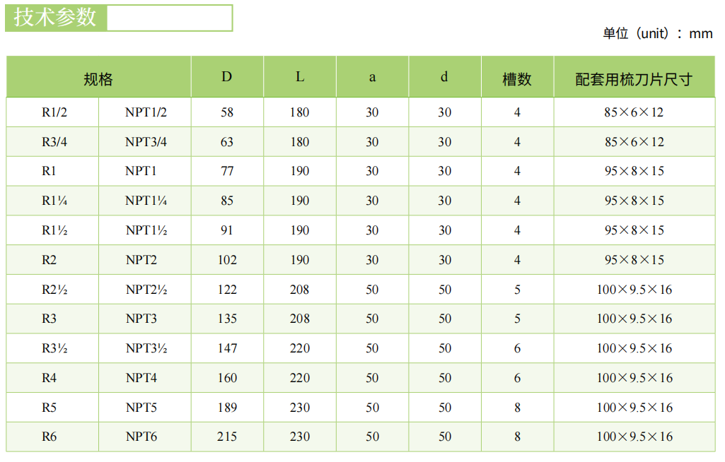 R、NPT系列圓錐管螺紋梳刀體與本公司生產(chǎn)的R、NPT圓錐螺紋梳刀體配套使用。該系列產(chǎn)品適用于螺紋密封的管螺紋(R、NPT)圓錐外螺紋的加工,加工出的螺紋符合GB/T7306.2-2000 eqv ISO7-1:1994、ASME B1.20.1-1983和GB/T12716-2002標(biāo)準(zhǔn)的要求。