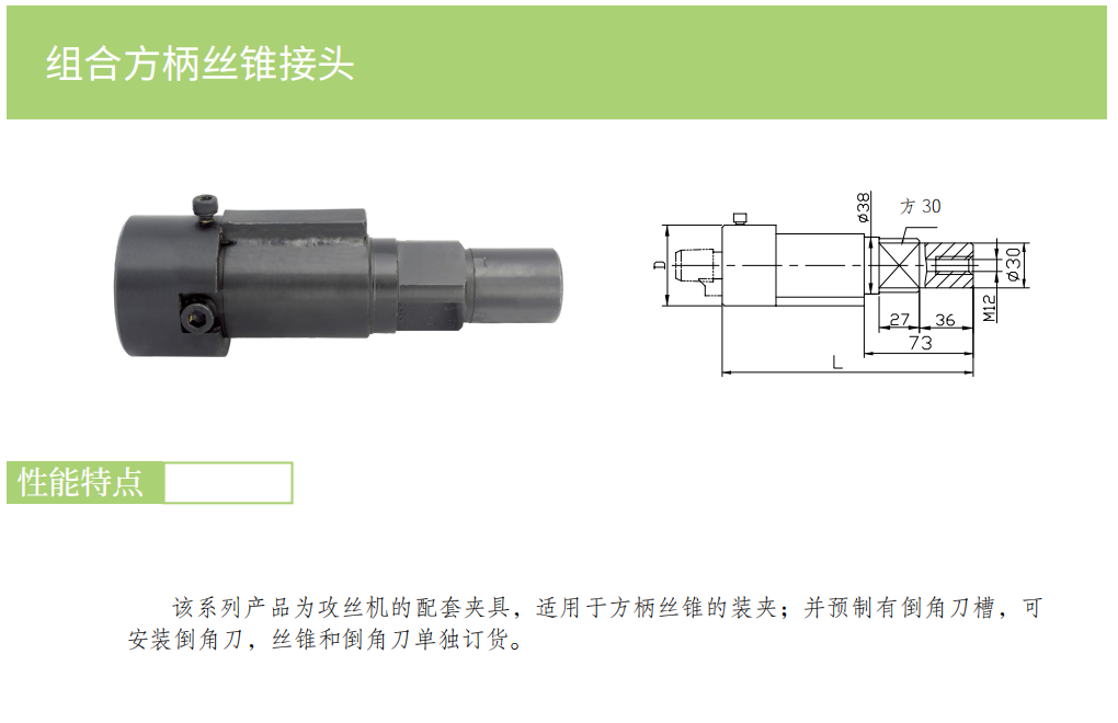 該系列產(chǎn)品為攻絲機(jī)的配套夾具,適用于方柄絲錐的裝夾,并預(yù)制有倒角刀槽,可安裝倒角刀,絲錐和倒角刀單獨(dú)訂貨。